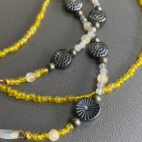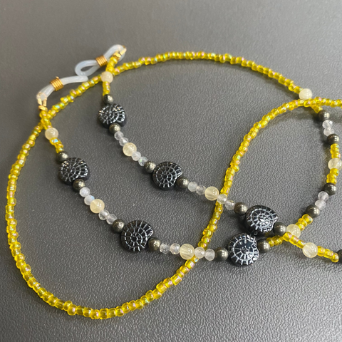 These wonderful handmade glasses chains are made from a combination of semi precious stones and seed beads. The design consists of Hematite Fossil shaped beads as well as Selenite, Labrodite and Pyrite.