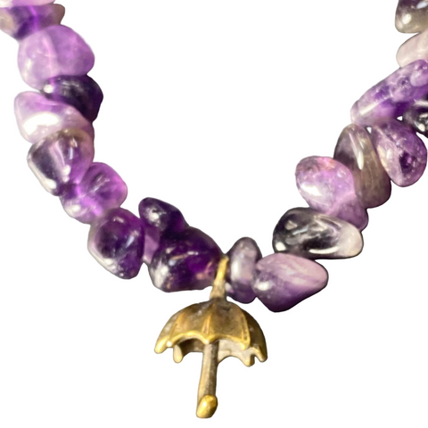 These wonderful Amethyst phone straps are embellished with an antique brass finish umbrella charm. Amethyst has qualities that can aid relaxation and a calming effect. They will be sent in their own organza pouch.