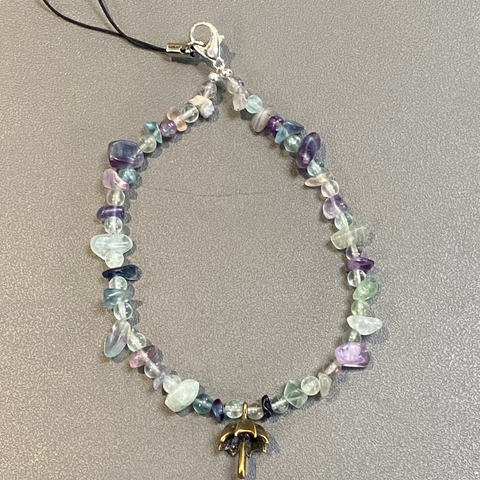 These wonderful Fluorite crystal beaded phone straps are embellished with a decorative umbrella charm. They will be sent in their own organza pouch, along with the crystal properties card. Fluorite has qualities that can assist with clarity and improves mental enhancements.